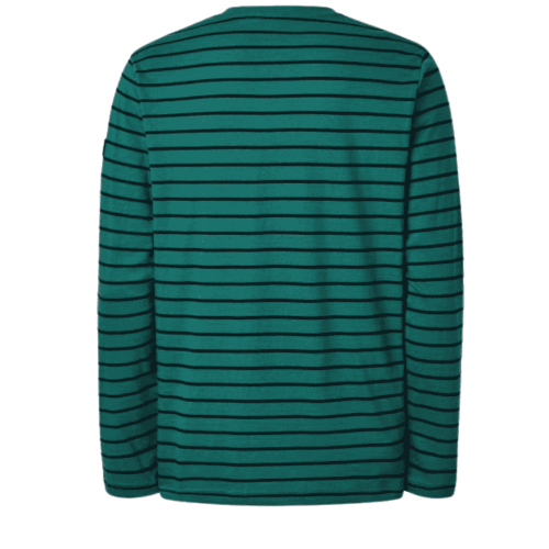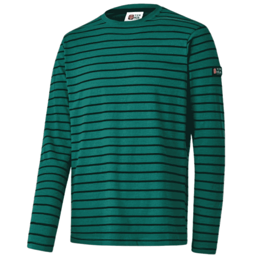 Camiseta de manga larga a rayas en algodón orgánico, cultivado sin pesticidas ni herbicidas. Destaca por su ligereza, comodidad y fabricación en Portugal, perfecta para uso casual.